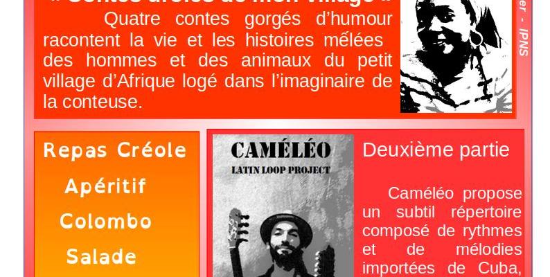 Quelques contes africains, racontés et chantés par Virginie Mouanda, nous mettront en bouche avant un repas créole, et, seront suivis de chants et musiques latinos, avec Caméléo, peut-être même cette musique vous donnera-t-elle envie de danser ! (voir affiche ci-jointe)