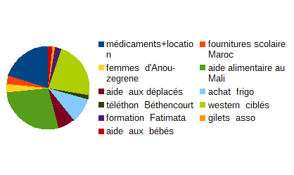 - participation au marché de Noël à Ault en décembre (2 jours) L’ensemble de ces manifestations, venant s’ajouter aux cotisations et aux dons de nos donateurs, ainsi qu’à la subvention de la commune, a généré des bénéfices nous permettant d’agir au mieux de nos moyens auprès de ces populations en grande détresse. Les actions humanitaires de très grande urgence ont été majoritaires tout au long de cette année ; les difficultés sécuritaires sont encore et toujours à l’ordre du jour.